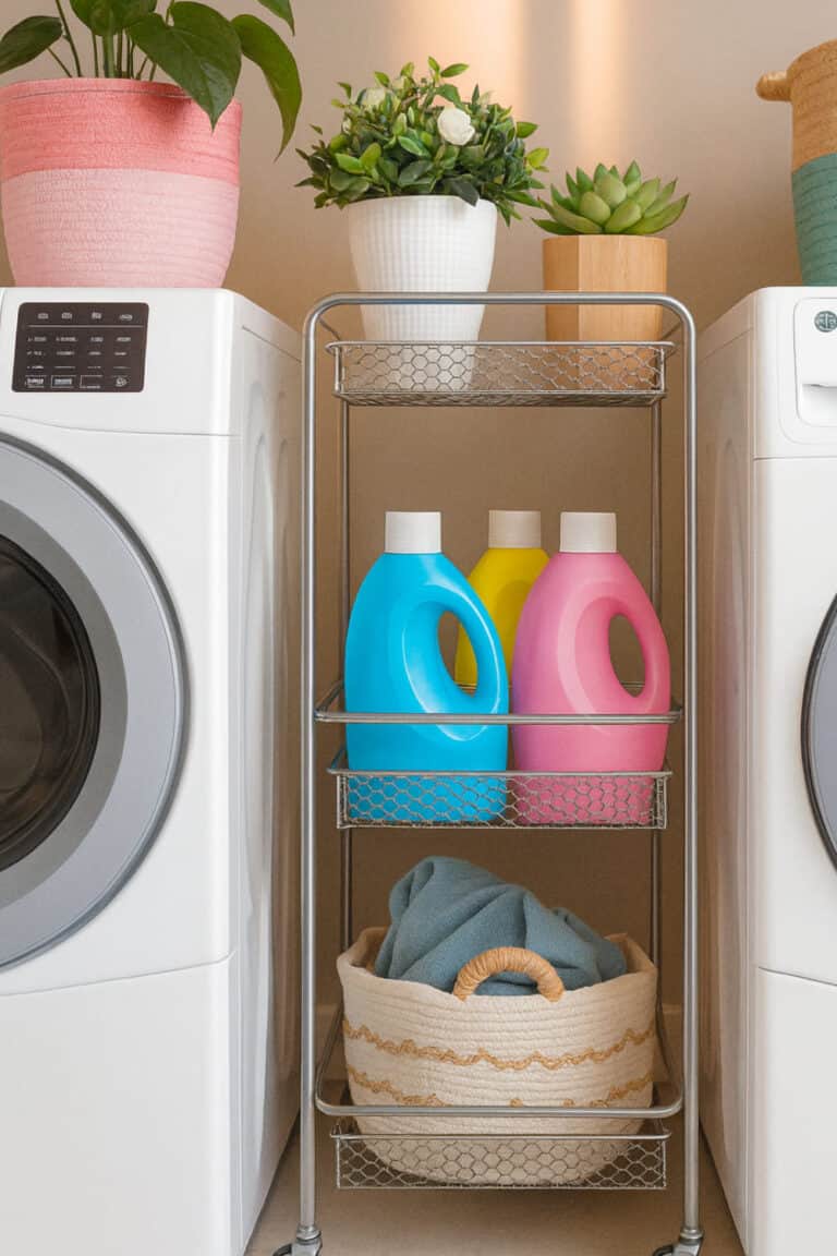 I grabbed a three-tier cart and now I store scent boosters, dryer sheets, and clothespins. It feels like a tiny mobile laundry station and looks intentional instead of random.